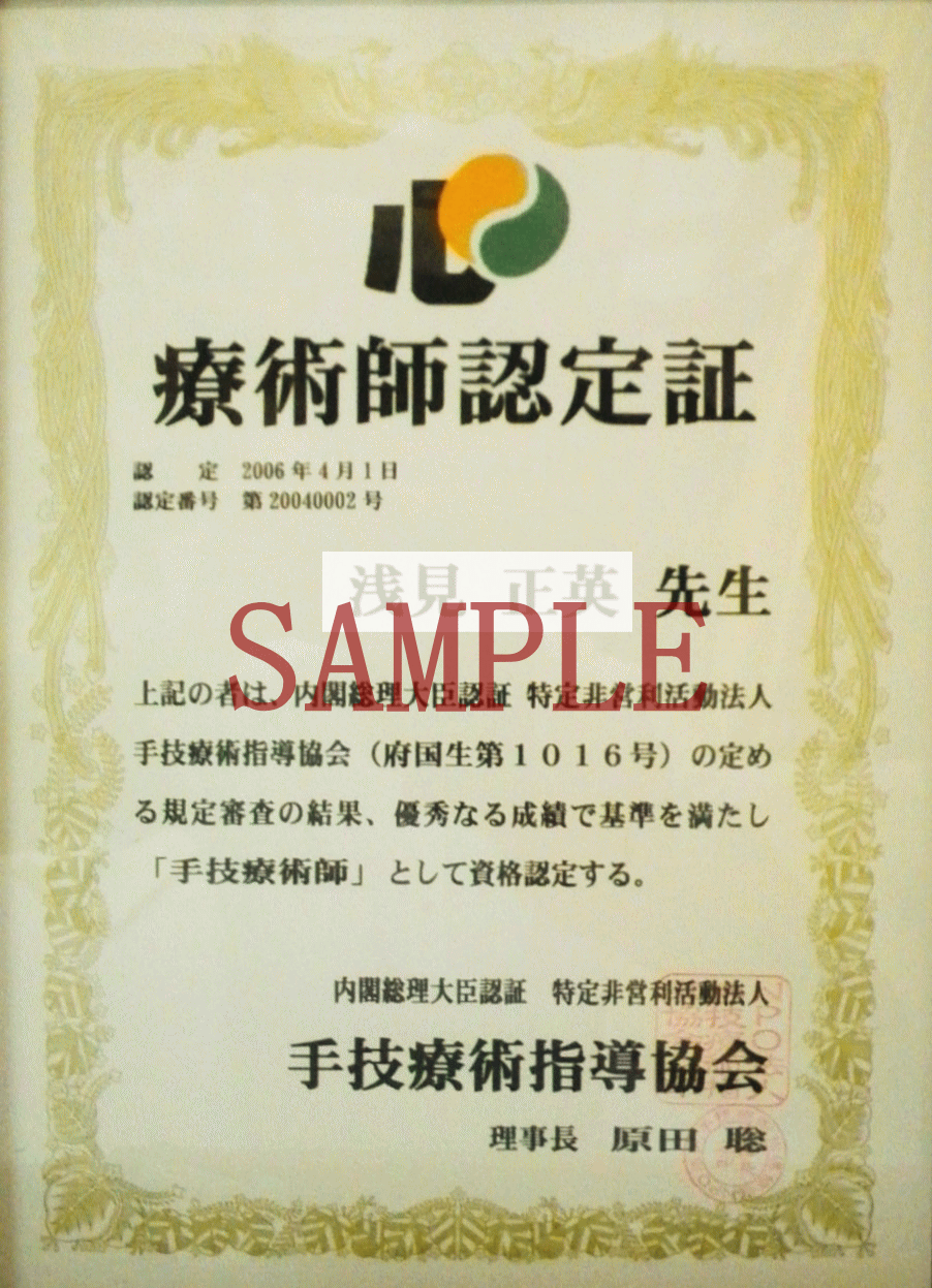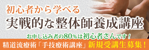 ![]() @概要 整体師養成講座は、手技療術師として独立・開業するための理論・ 技術を学ぶコースです。 講師は、NPO法人手技療術指導協会の技術指導員である学院長が直接 指導いたします。現役の療術師ですので、理論だけでなく、すぐに使 える実践実技を学ぶ事が出来ます。 講義は、実技講座が70%、理論講座が30%です。卒業後すぐに療術師と して活躍することが出来るように指導いたします。 A受講期間 : 18〜24ヶ月 (約160時間) ※講義は、個々のレベルに合わせて進行しますので、受講期間が異なる 場合があります。(追加講習無料) B入学資格 : 年齢・性別・学歴不問。(適正試験有り) C受講費用 : 入会金: 100,000円 受講料: 550,000円 (手技療術指導協会入会費&初年度年会費含む) D受講内容 @学科ー東洋医学の基礎知識・解剖学 ・人体生理学・栄養学・基本病理学 A実技ー精道流療術の基本操作〜症状別施術方法 (整体・カイロプラクティック・運動療法・実技応用) B手技療術師の使命と役割 E受講日 : 週に1〜2回 (現在、特定の曜日を設定しておりません。 スケジュールは相談して決めます) F卒業試験 : @学科 A実技 B論文 卒業後は ※卒業後の追加講習も可能です。 ※卒業後の開業・就職相談は随時受け付けしております。 ※卒業試験合格者は、『内閣府認証 NPO法人 手技療術指導協会』 への入会が可能です。試験なしで療術師の認定が受けられます。 ←手技療術指導協会療術師認定書![]() @概要 入門講座は、手技療術師としての基礎である技術と知識を学ぶ コースです。ご自身や家族などの施術を念頭に、基本的な健康 管理、施術方法を学んでいきます。 講義は、実技講座が70%、理論講座が30%です。 ※療術師養成講座への移行は随時可能です。 A受講期間 : 約4ヶ月 (全15回 約35時間) ※講義は、個々のレベルに合わせて進行します。 B入学資格 : 年齢・性別・学歴不問。(適正試験有り) C受講費用 : 受講料: 162,000円 D受講内容 @学科ー東洋医学の基礎知識・基本的な解剖・生理・栄養・病理学 A実技ー精道流療術の基本操作 (整体・カイロプラクティック・運動療法) B手技療術師の使命と役割 E受講日 : 週に1〜2回 (現在、特定の曜日を設定しておりません。 スケジュールは相談して決めます) 講座終了後は・・・ 更に学びたい場合は療術師養成講座への移行が可能です。 入門講座の受講は一人一回とさせて頂きます。 ![]() @概要 スキルアップ講座は、すでにの学校などで療術師としての技術を 習得し、基礎がある程度できている方を対象としたコースです。 東洋医学や精道流療術の技術・知識を習得しながら 現状での課題や足りない知識、技術等を学んでいきます。 講義は、実技講座が70%、理論講座が30%です。 ※療術師養成講座への移行は随時可能です。 A受講期間 : 約4ヶ月 (全15回 約35時間) ※講義は、個々のレベルに合わせて進行します。 B入学資格 : 療術師・有資格者 (適正試験有り) C受講費用 : 受講料: 162,000円 D受講内容 @学科ー東洋医学の基礎知識・解剖学・人体生理学・基本病理学 A実技ー精道流療術の基本操作 (整体・カイロプラクティック・運動療法・実技応用) B手技療術師の使命と役割 E受講日 : 週に1〜2回 (現在、特定の曜日を設定しておりません。 スケジュールは相談して決めます) 講座終了後は・・・ 更に学びたい場合は療術師養成講座への移行が可能です。 スキルアップ講座の受講は一人一回とさせて頂きます。