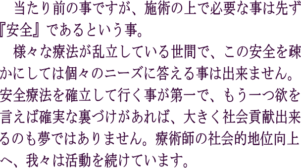 わが国に於ける手技療術師の社会的地位は様々な状況からして、低く見られているのが現状です。それには先ず私達、療術師の意識の改革が必要です。本来の精神を忘れ、神髄を置き去りにしてどうして人の為に尽くせるのでしょうか?一人一人の意識を改革してこそ、初めて社会貢献となり、社会に認められ、手技療術師として胸を張って業務を遂行できると思われます。